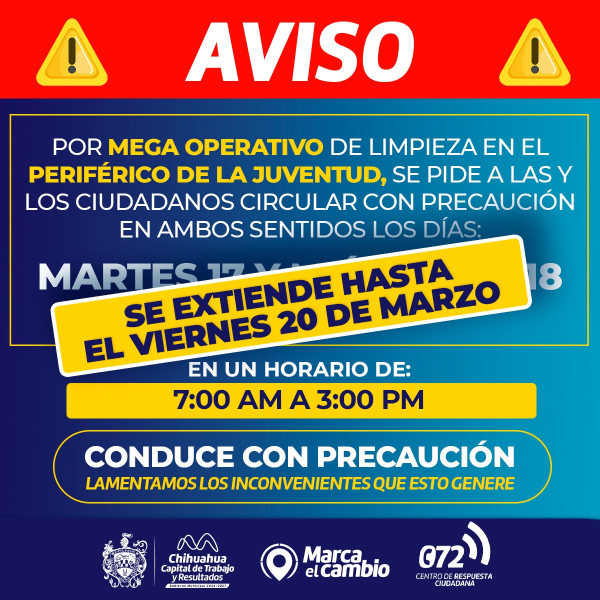 Con el objetivo de tener una ciudad más limpia, ordenada y bonita, el Gobierno Municipal, a través de la Dirección de Mantenimiento Urbano, informa que el Mega Operativo de Limpieza en el Periférico de la Juventud se extenderá hasta el próximo viernes 20 de marzo.