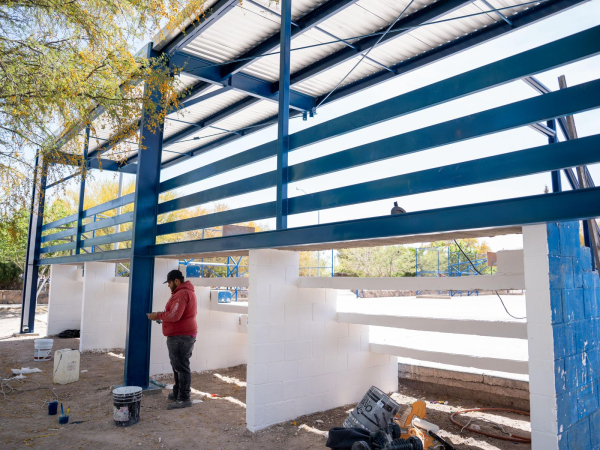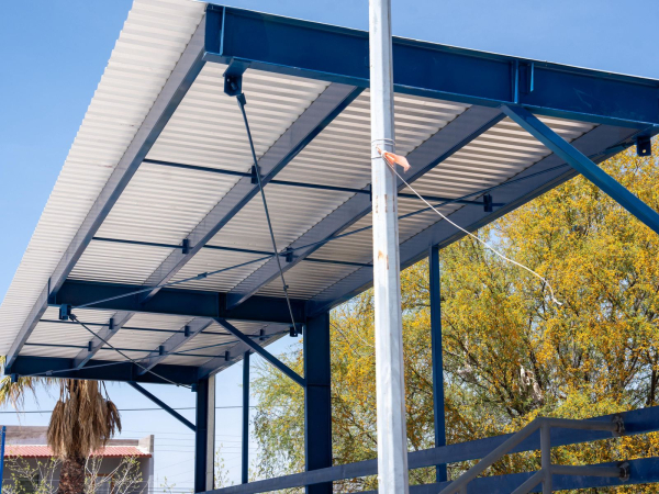 La Dirección de Obras Públicas de Delicias avanza en la fase final de la construcción de una techumbre sobre gradas en la cancha de la plaza principal de la colonia Campesina, informó su titular, Alfonso Rodríguez Porras. El proyecto forma parte de las obras ejecutadas a través del esquema de presupuesto participativo.