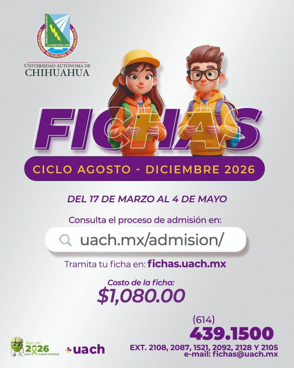 El periodo de fichas para nuevo ingreso comenzó hace pocos días, estará activo del 17 de marzo al 4 de mayo. Esta será para el ciclo escolar agosto-diciembre 2026. Estas se podrán tramitar por medio de la página web https://uach.mx/admision/ o directamente en las oficinas de la facultad de 9 am a 2 pm y de 5 pm a 7 pm.
