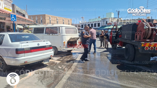 Delicias. – El propietario de un automóvil Volkswagen línea Combi de modelo atrasado vivió momentos de tensión a la 1 pm cuando de manera repentina su motor sufrió un conato de incendio mientras se encontraba en el círculo del Mercado Juárez, frente a la dulcería Casa Portillo.
