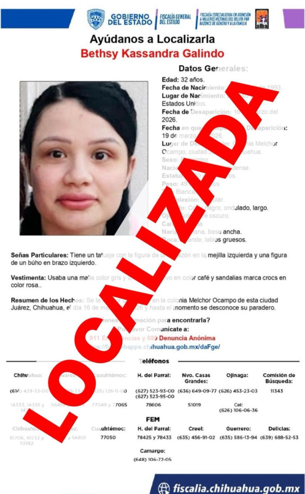 La Fiscalía Especializada en Atención a Mujeres Víctimas del Delito por Razones de Género y a la Familia en la Zona Norte, localizó sanos y salvos a Bethsy Kassandra G., de 32 años de edad y a su menor hijo de iniciales A. L. M., de dos años de edad, quienes contaban con reporte de desaparición y/o ausencia, interpuesto el 16 de marzo de 2026, en Ciudad Juárez.