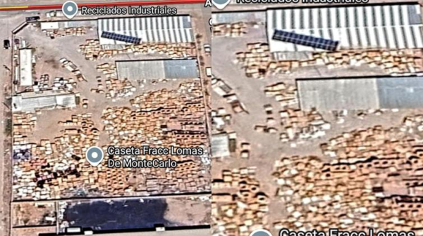 Una imagen satelital del predio afectado por el incendio registrado al norte de la ciudad de Chihuahua muestra las cientos de tarimas que tenían almacenadas y las distintas bodegas que quedarán reducidas a cenizas tras el mega incendio.
