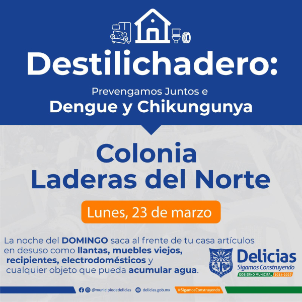 El lema es ‘’sin criaderos México protege su salud y su mundial’’, las autoridades de salud y Servicios Públicos Municipales durante la jornada nacional realizarán campañas de destilichaderos y fumigaciones por lo que piden estar atentos al cronograma para conocer cuando visitará su colonia. En el caso del destilichadero ya se está realizando en Delicias y hoy estarán en Laderas del Norte.