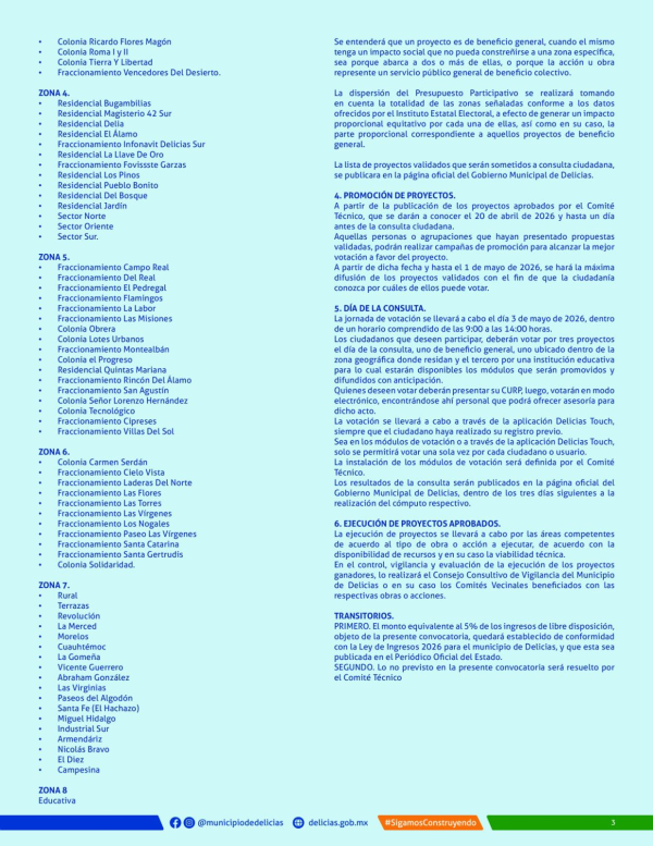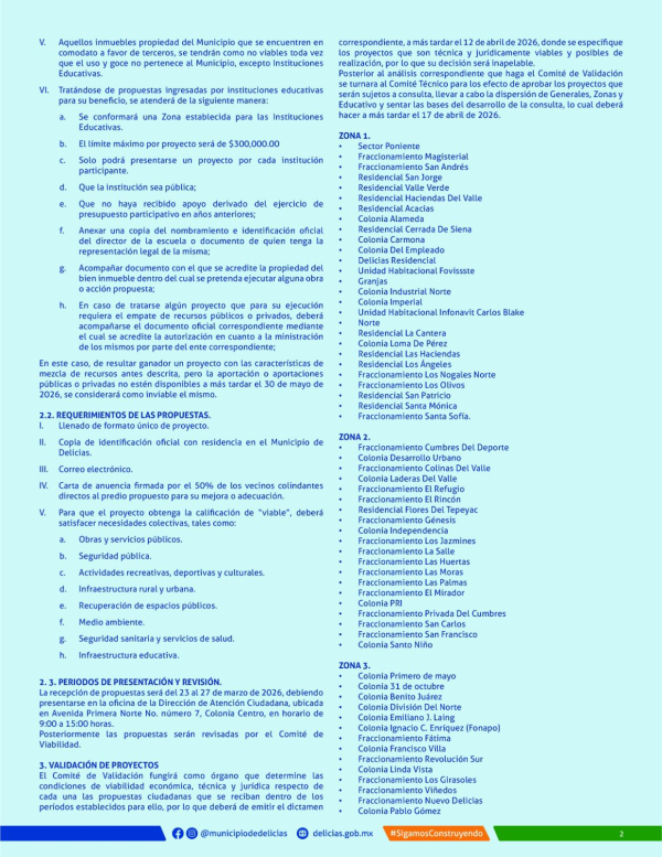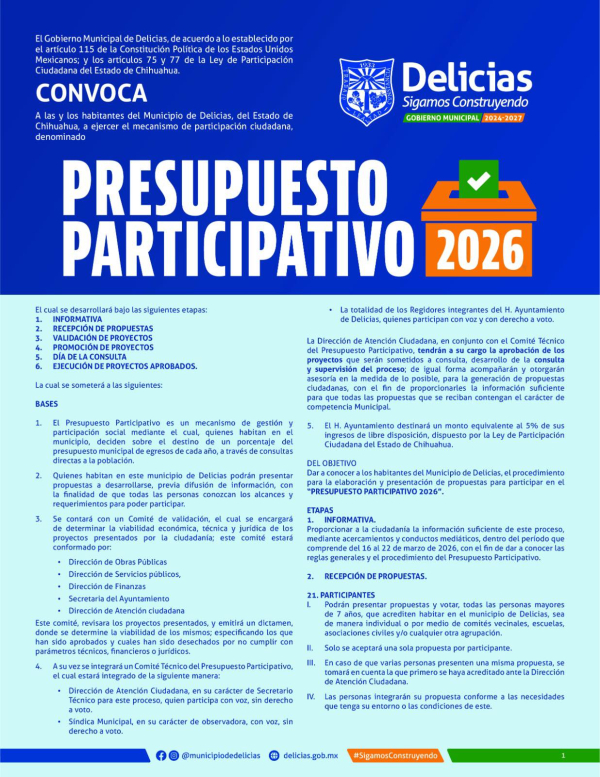 Delicias. – Como cada año el Gobierno Municipal de Delicias destina 5% del recurso anual en proyectos que la ciudadanía propone para mejorar su colonia a través del Presupuesto Participativo. Invitan a participar en la edición 2026 pues ya quedan pocos días.
