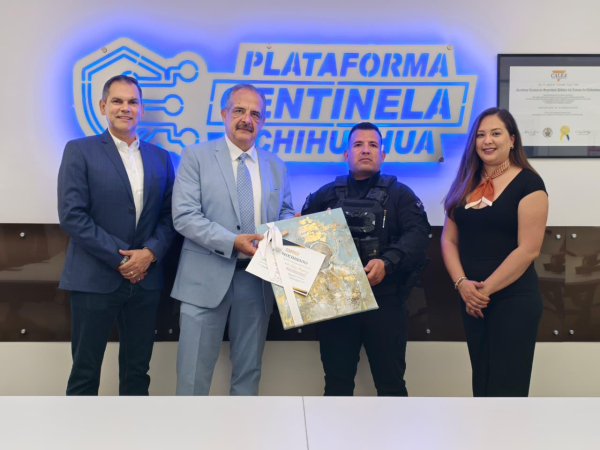 El presidente de la Cámara Nacional de Comercio (CANACO) Chihuahua, Alejandro Lazarotto, hizo entrega de un reconocimiento al elemento de la fuerza especial SWAT de la Secretaría de Seguridad Pública del Estado (SSPE), Fernando López Minjarez, por sus acciones destacadas que le valieron la distinción como Policía del Año 2025, reconocimiento previamente otorgado por el secretario Gilberto Loya.