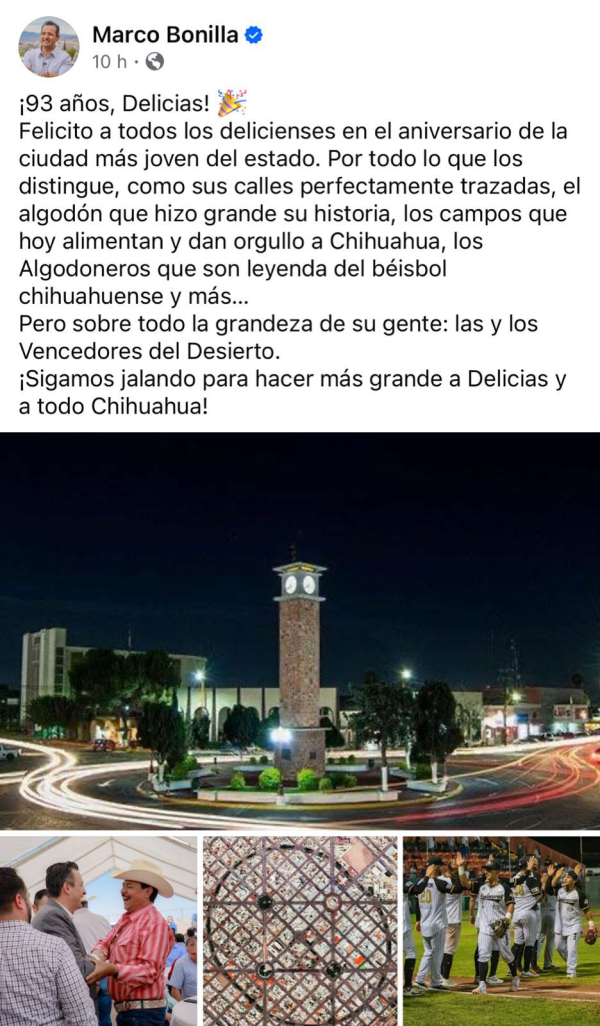 Felicito a todos los delicienses en el aniversario de la ciudad más joven del estado. Por todo lo que los distingue, como sus calles perfectamente trazadas, el algodón que hizo grande su historia, los campos que hoy alimentan y dan orgullo a Chihuahua, los Algodoneros que son leyenda del béisbol chihuahuense y más…