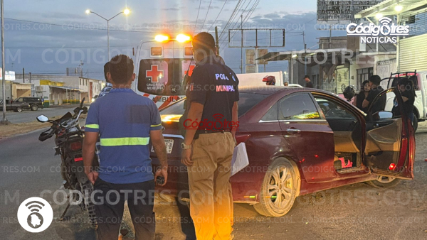 Un accidente vial se registró sobre la avenida Plutarco Elías Calles, donde un vehículo Hyundai color rojo que circulaba de norte a sur terminó impactando a una motocicleta tipo motocross.