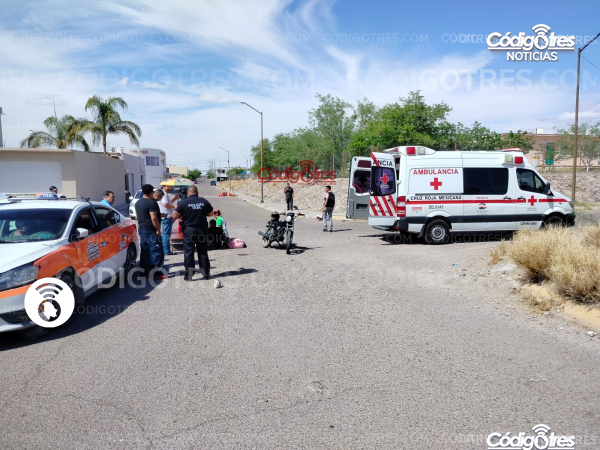 Un accidente vial se registró en el cruce de la calle Pino Silvestre y Monterrey, dejando como saldo a un motociclista lesionado y daños materiales considerables.