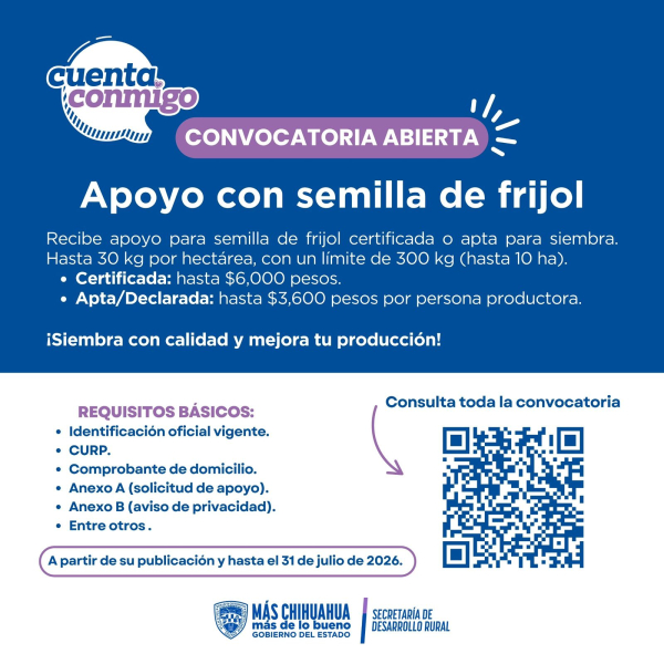 La Secretaría de Desarrollo Rural del Gobierno del Estado informa que se encuentra disponible la convocatoria para acceder al apoyo de semilla de frijol, como parte del programa Cuenta Conmigo en el Campo.