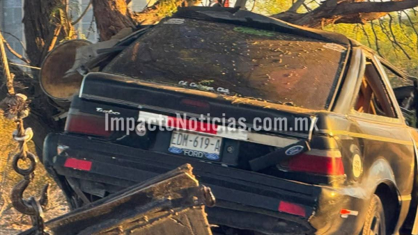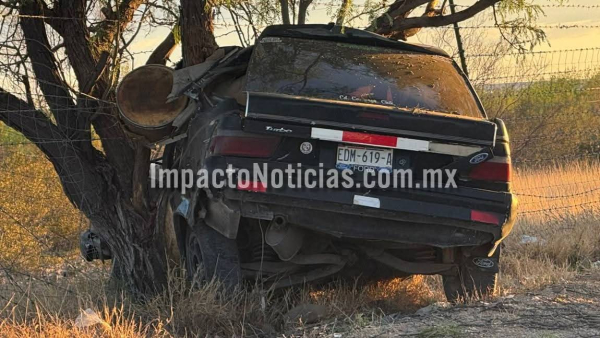 Tras el fuerte impacto contra un mezquite, personal de SEMEFO realizó las labores para extraer el cuerpo del interior del vehículo.