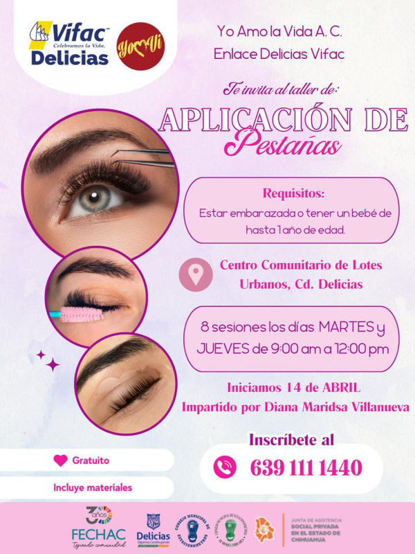 Delicias. – Mañana 14 de abril arranca un taller más de la asociación ‘’Yo Amo la Vida’’ enlace Delicias Vifac, ahora siendo de aplicación de pestañas. El cual tiene el objetivo de fomentar el autoempleo de mujer embarazadas o con bebés de un año al ser la etapa más difícil para las madres al momento de buscar un trabajo.