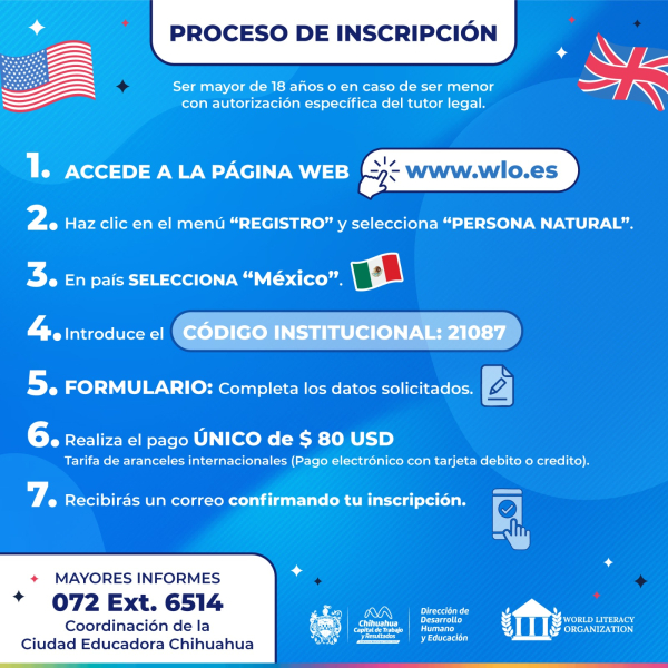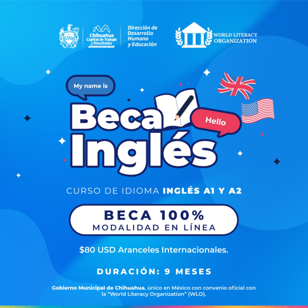 H. Ciudad de Chihuahua, Chih., a 15 de abril de 2026.- El Gobierno Municipal de Chihuahua, invita a la ciudadanía a registrarse en la Beca de Inglés, disponible gracias a la colaboración con la World Literacy Organization (WLO) y el respaldo académico de la Universidad CEU Cardenal Herrera.