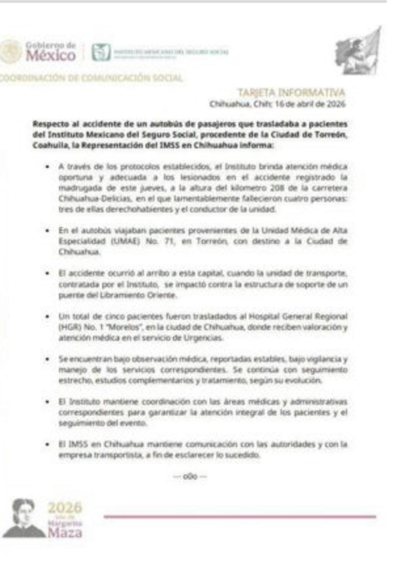 De acuerdo con el Instituto, tres de las víctimas eran derechohabientes y el conductor de la unidad —quien presuntamente se quedó dormido al volante— también perdió la vida. En el autobús viajaban pacientes que regresaban de la Unidad Médica de Alta Especialidad (UMAE) No. 71, en Torreón, con destino a la ciudad de Chihuahua.