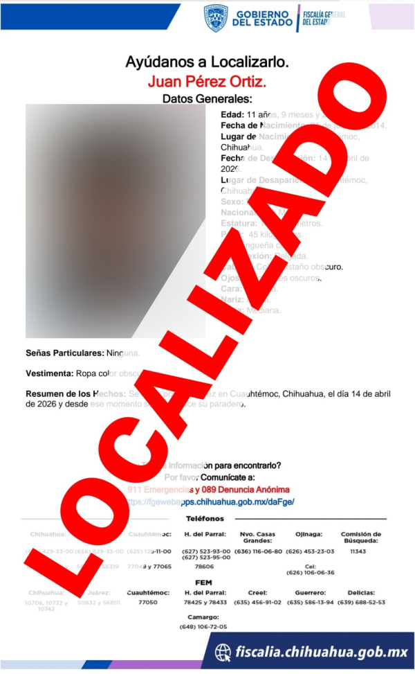 La Fiscalía de Distrito Zona Occidente, localizó sanos y salvos a seis menores de edad, quienes el pasado martes 14 de abril se salieron sin autorización de un albergue de la ciudad de Cuauhtémoc, por lo que fue reportada su ausencia.