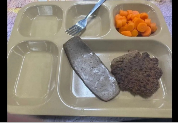 Otra imagen de una cena en el Abraham Lincoln, que compartió por un miembro del personal con su familia, muestra un pequeño puñado de zanahorias hervidas, una empanada seca y un trozo gris de carne procesada.