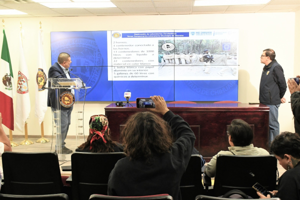 El Fiscal General del Estado de Chihuahua, César Jáuregui Moreno, informó en rueda de prensa, detalles sobre el hallazgo de un total de seis laboratorios clandestinos en el municipio de Morelos, en los que se elaboraban drogas sintéticas, cuya localización, dijo fue resultado de un trabajo de investigación de aproximadamente tres meses, realizado entre la Agencia Estatal de Investigación y la Secretaría de la Defensa Nacional.