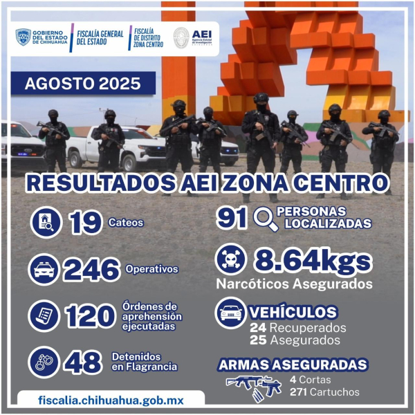 La Agencia Estatal de Investigación realizó 246 operativos durante el mes de agosto, periodo en el que ejecutó 120 órdenes de aprehensión en los 19 municipios que comprende la juridicción de la Fiscalía de Distrito Zona Centro.