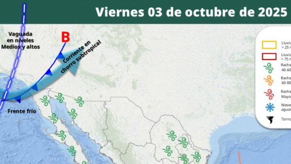 Según el mapa de sistemas del día viernes 3 de octubre, el Frente Frío -que será el número 5 si se confirma- entrará al noroeste de México, impulsando una corriente en chorro subtropical y una vaguada en niveles medios y altos.