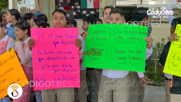 Delicias. – Esta mañana entre gran nostalgia y alegría realizaron una ceremonia de jubilación para las maestras de español Carlota Estela Pérez Cano y Silvia Jesús Gutiérrez Gallegos de la Secundaria 96 ‘’Vencedores del Desierto’’.