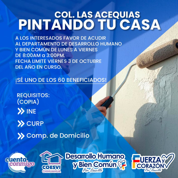 Saucillo, Chih. — El alcalde municipal, Fito Gardea, anunció el arranque del programa “Pintando tu Casa”, que beneficiará a 60 viviendas de la colonia Las Acequias, como parte de las gestiones realizadas ante la Comisión Estatal de Vivienda, Suelo e Infraestructura (COESVI) de Chihuahua y con el respaldo de la gobernadora Maru Campos.