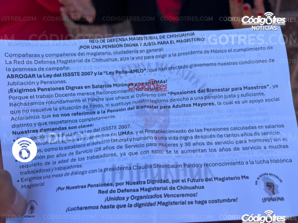 La maestra Miriam Ramírez, explica que hoy se manifiestan al ser de la Red Magisterial del Estado de Chihuahua en apoyo al paro se está realizando a nivel nacional y estatal para la derogación del ISSSTE 2007.