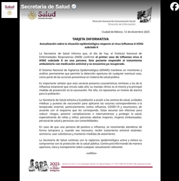 La Secretaría de Salud confirmó este jueves el primer caso en México de influenza A H3N2 subclado K, detectado por el Instituto Nacional de Enfermedades Respiratorias (INER).