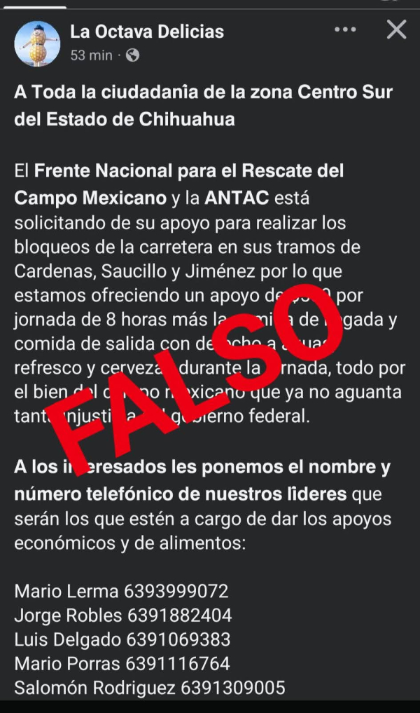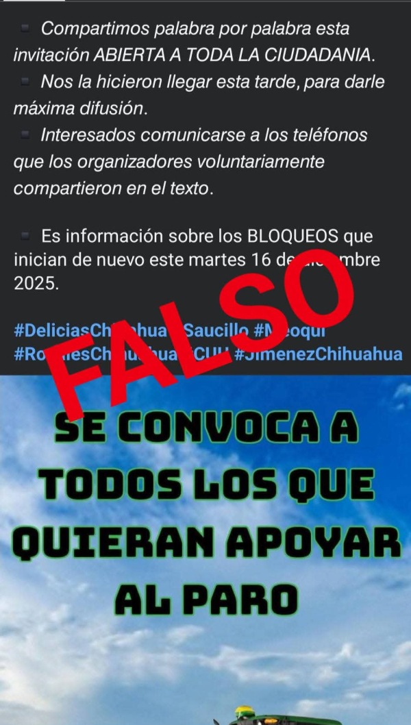 Luis Delgado, representante de Agricultores Unidos de Chihuahua, desmintió categóricamente una publicación que actualmente circula en redes sociales, principalmente en diversos grupos de venta, en la cual se convoca a la ciudadanía en general a congregarse el día de mañana en distintas carreteras del estado con la finalidad de bloquearlas, bajo el argumento de una supuesta manifestación en contra del Tratado de Aguas.