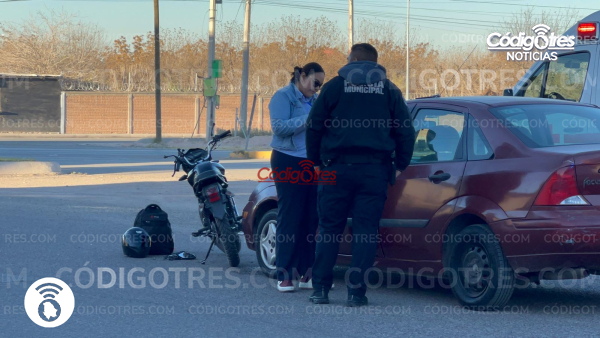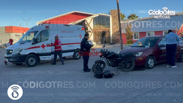 Delicias. – Cerca de las 8:30 am un motociclista y un automóvil tuvieron un percance vial en la Av. Rio San Pedro sur y C. 10 sur, frente al restaurante El Granero.