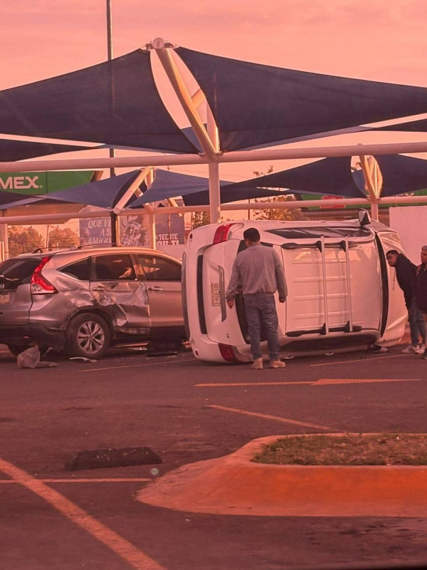 Durango.- La mañana de este miércoles, se registró un accidente inusual dentro del estacionamiento de Walmart Francisco Villa, donde un conductor impactó su camioneta contra otro vehículo y terminó volcado. 🚗💥