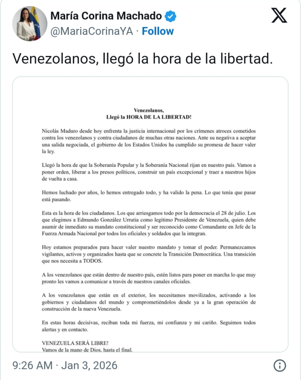 Machado, rompiendo el silencio que durante todo el día habían mantenido los líderes de la oposición venezolana, dijo que "llegó la hora de la libertad". "Nicolás Maduro desde hoy enfrenta la justicia internacional por los crímenes troces cometidos contra los venezolanos", comienza el comunicado.
