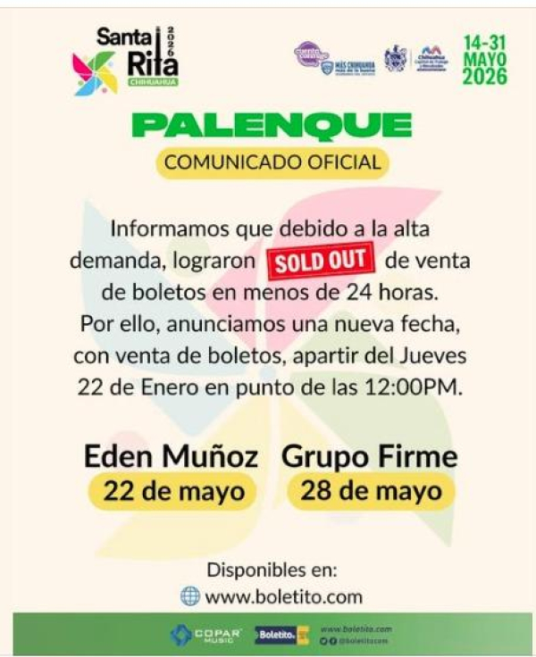 A través de un comunicado oficial, el palenque de la Feria de Santa Rita anunció que se abrirían dos fechas más luego de que ayer se agotaron las entradas para Edén Muñoz y Grupo Firme.
