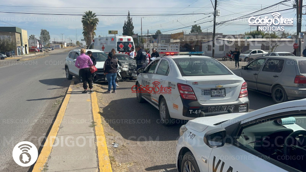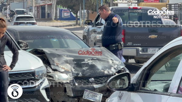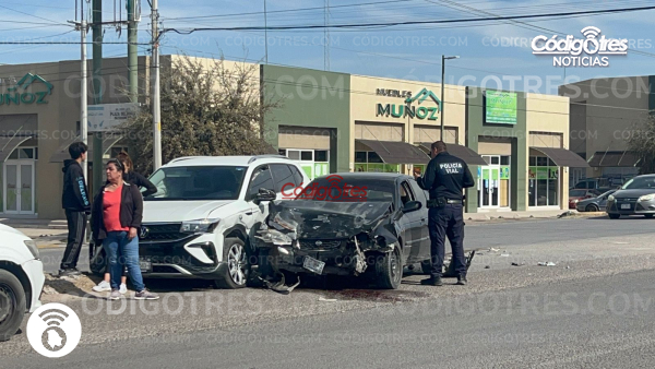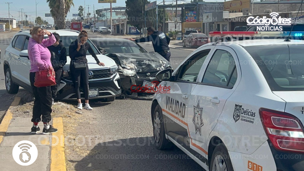 Delicias. – Dos automóviles se impactaron en la Av. Calzada del Charro y Av. 6ta oriente, frente a la plaza comercial Delfines, lo que ocasionó bastante trafico en el área al ser hora altamente concurrida.