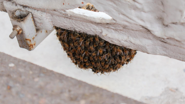 Meoqui. – Esta mañana Bomberos de Meoqui atendió un llamado en el seccional de Guadalupe Victoria en donde unas abejas crearon su panal en una banca.