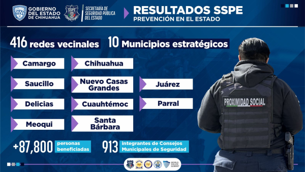 Se destacó que actualmente, a través de la Subsecretaría de Participación Ciudadana y Prevención del Delito, se han conformado 416 redes vecinales en distintos municipios, entre ellos Camargo, Saucillo, Delicias, Meoqui, Nuevo Casas Grandes, Cuauhtémoc, Santa Bárbara, Juárez y Parral.