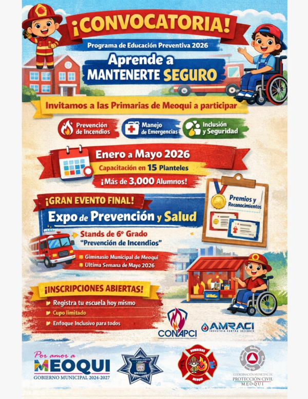 Martín Orona, inspector de Protección Civil y Bomberos, recordó que el programa “Aprende a Mantenerte Seguro” tiene como finalidad fomentar el autocuidado y la cultura de la prevención en niñas y niños, especialmente ante el riesgo de incendios. Durante el ciclo escolar enero–mayo, esta capacitación se imparte en 10 escuelas del municipio, mencionando que como parte de la graduación se realizará esta Expo, donde las escuelas participantes demostrarán lo aprendido mediante la instalación de sus stands. La evaluación estará a cargo de elementos de Bomberos ajenos a la capacitación, con el fin de garantizar imparcialidad y verificar el aprovechamiento de los contenidos.