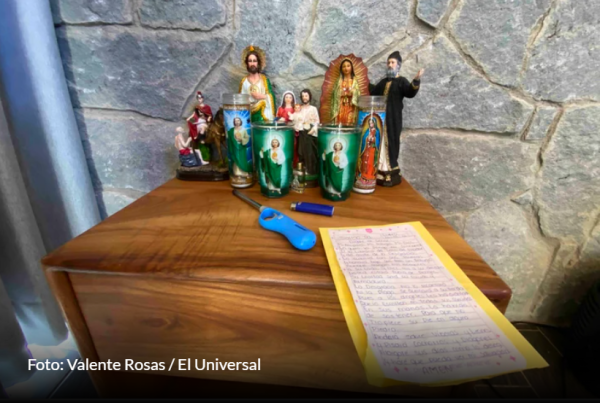 Uno de los elementos que más llamó la atención dentro del inmueble fue un altar religioso colocado en una de las habitaciones. Ahí se encontraban imágenes de la Virgen de Guadalupe, San Judas Tadeo y San Chárbel, además de un texto escrito a mano con fragmentos del Salmo 91, con fecha de enero de 2026.