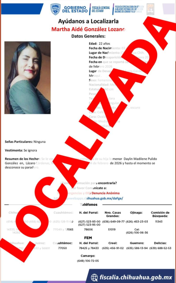Su familia presentó reporte ayer, 23 de febrero por la tarde noche en la ciudad de Chihuahua luego de haber sido vistas por última vez el 04 de febrero del 2026.