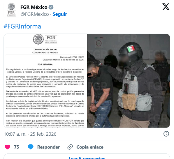 La Fiscalía General de la República confirmó que familiares de Nemesio Oseguera, “El Mencho”, reclamaron su cuerpo a través de un representante jurídico. Las autoridades ya preparan las gestiones para la entrega de los restos del líder del CJNG.