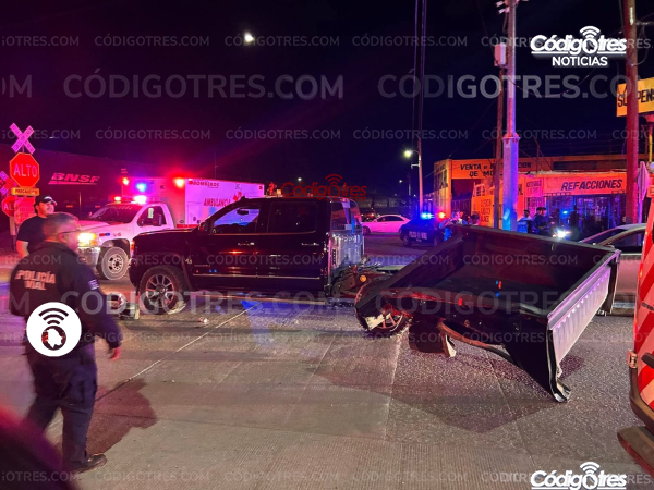 Cd. Meoqui, Chih. - La madrugada de este sábado se produjo un violento encontronazo entre un tren y una camioneta pick up en el cruce de la calle Degollado y la avenida del Ferrocarril. Según testigos, el conductor de la GMC Denali intentó cruzar la vía antes de que llegara el tren, lo que provocó el brutal impacto.