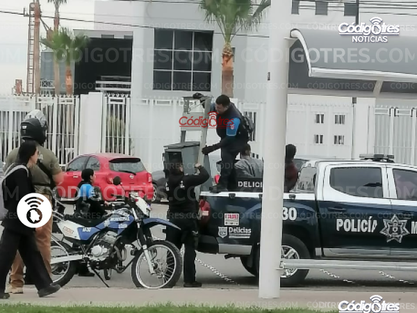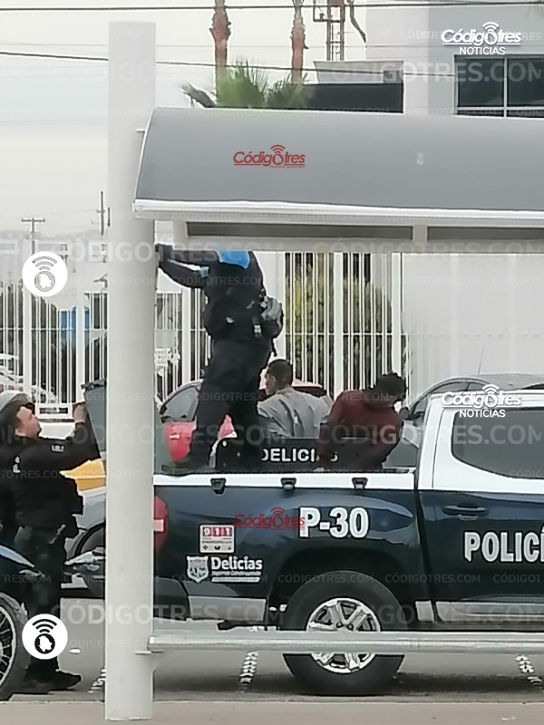 El hecho se dio en la Av. Tecnológico y Av. Ferrocarril. 2 hombres fueron esposados y subidos a la unidad 30 de Seguridad Pública Municipal, al lugar acudieron también 4 unidades motorizadas.