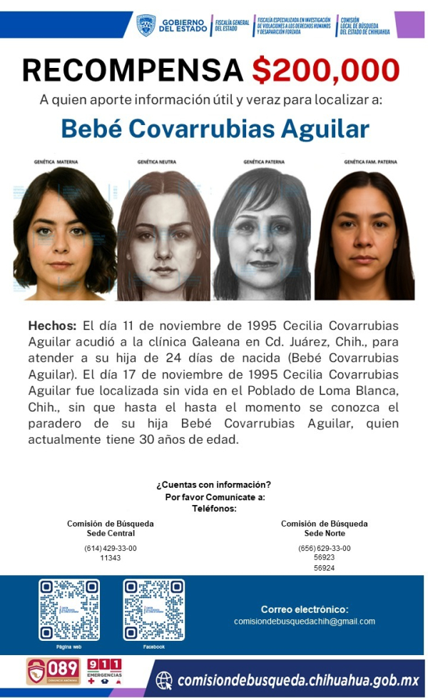 En el marco del 30 aniversario de la desaparición de la adolescente Cecilia Covarrubias Aguilar y su bebé, la Fiscalía Especializada en Investigación de Violaciones de Derechos Humanos y Desaparición Forzada, informó que la Comisión Local de Búsqueda de Chihuahua mantiene vigentes las acciones para localizar a la pequeña de apellidos Covarrubias Aguilar, quien permanece en calidad de desaparecida desde el año de 1995.