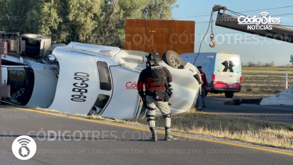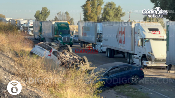 Una aparatosa volcadura de un tráiler tipo madrina, utilizado para el transporte de vehículos nuevos, generó un fuerte despliegue de autoridades y largas filas de automovilistas la mañana de este viernes en la carretera federal número 45, antes de llegar a la caseta de peaje de Saucillo.