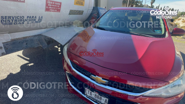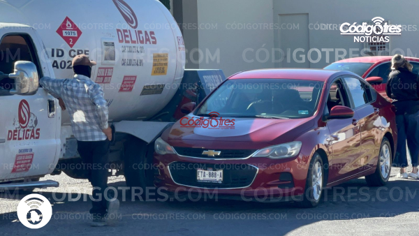 Un accidente vial se registró en el cruce de la avenida Conai y la calle Quinta Poniente, donde se vieron involucrados un automóvil particular y una pipa de gas, dejando como saldo daños materiales de consideración.