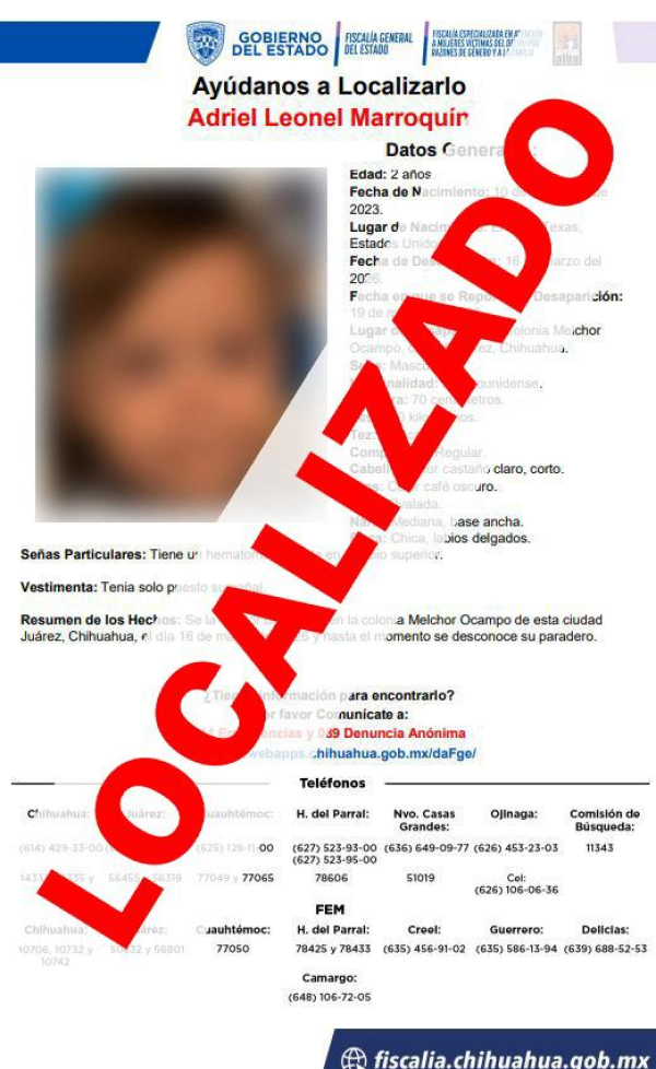La Fiscalía Especializada en Atención a Mujeres Víctimas del Delito por Razones de Género y a la Familia en la Zona Norte, localizó sanos y salvos a Bethsy Kassandra G., de 32 años de edad y a su menor hijo de iniciales A. L. M., de dos años de edad, quienes contaban con reporte de desaparición y/o ausencia, interpuesto el 16 de marzo de 2026, en Ciudad Juárez.