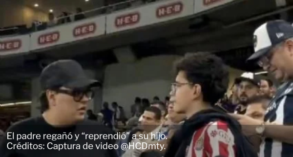 En un video que se hizo viral se observa que un padre reprende con manotazos a su hijo que presuntamente arrojó cerveza a fans de Monterrey.
