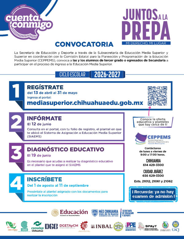 El subsecretario añadió que en https://mediasuperior.chihuahuaedu.gob.mx/ se puede consultar la oferta educativa que ofrece cada uno de los subsistemas, además de un directorio de planteles georreferenciado y una guía de estudios para la evaluación diagnóstica.