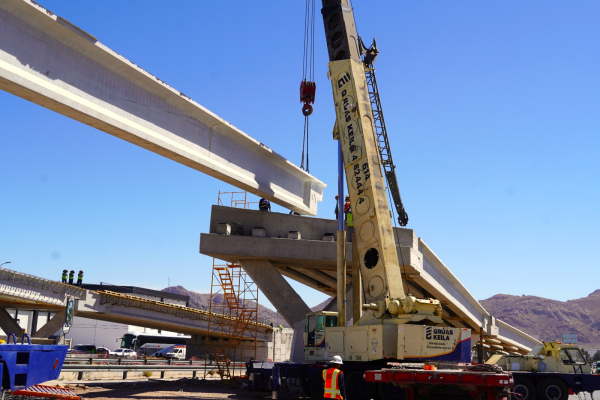 Con diversas actividades en distintos frentes de trabajo, esta emblemática obra sigue tomando forma día con día. Actualmente se mantiene el montaje de trabes de concreto reforzado, de las cuales más de 40 ya han sido colocadas, además de realizarse trabajos de cimbrado para la losa superior, como parte de la conformación de la superestructura del puente.