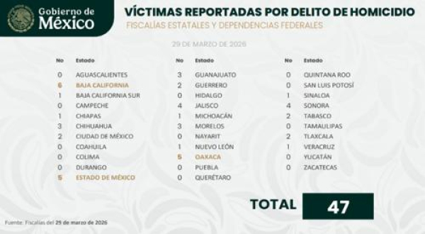 En el informe, tres entidades federativas fueron destacadas especialmente por la SSPC. Este caso es el de Baja California, con seis presuntas víctimas de homicidio, Estado de México y Oaxaca con cinco cada uno.