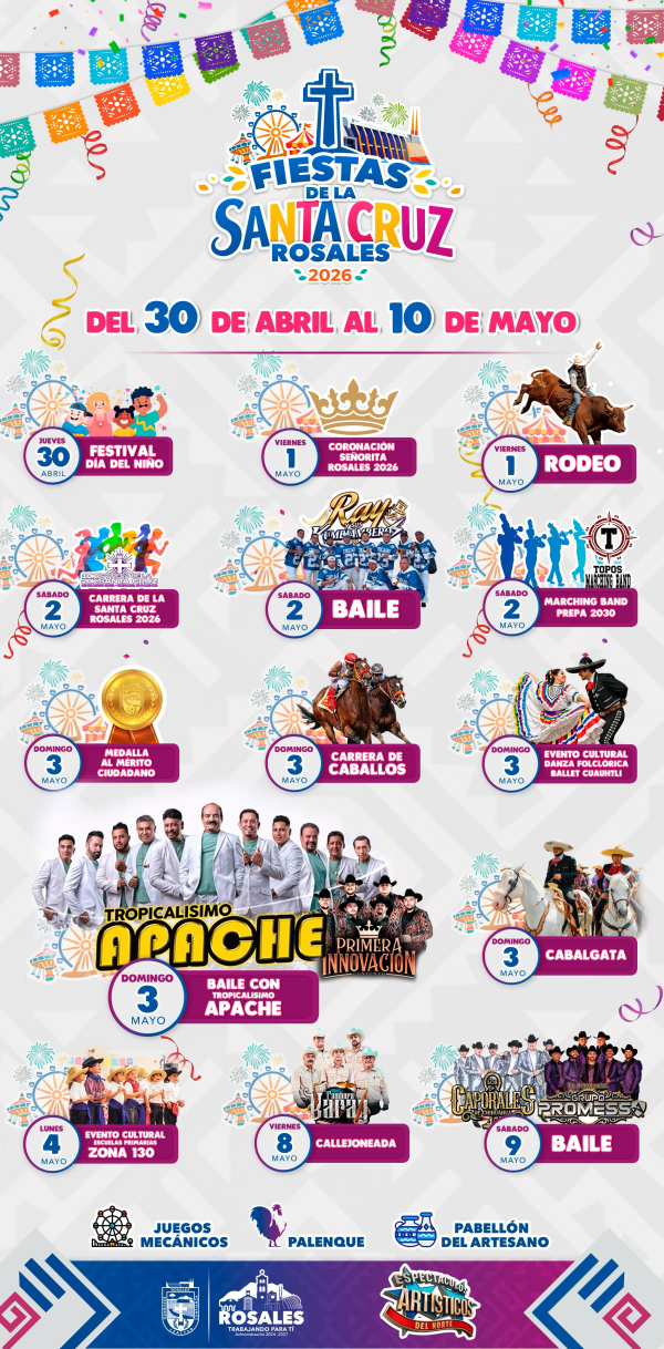 Rosales.- Las Fiestas Patronales de la Santa Cruz 2026, la tradición que nos une, inicia el próximo treinta de abril para culminar el diez de mayo, todas y todos invitados a gozar de actividades y presentaciones para todos los gustos y edades.