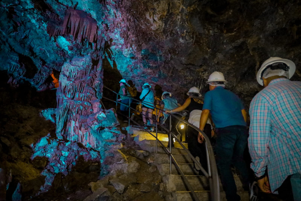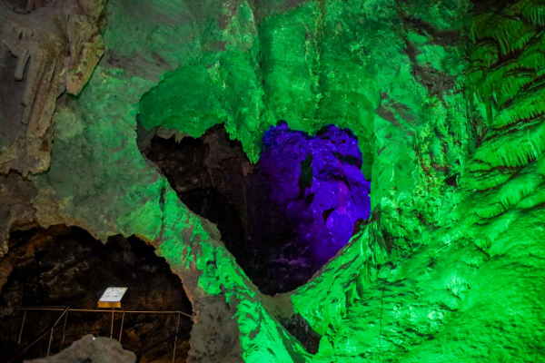 En su interior, las formaciones rocosas, estalactitas y estalagmitas cobran vida gracias al sistema de iluminación que resalta sus texturas y dimensiones, creando un entorno impresionante.
